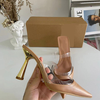 Yeni sivri Metal topuklu Pvc şeffaf bant ekleme Pu deri yüksek topuklu açık parmaklı Stiletto moda sandalet